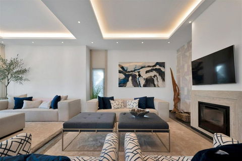 The open-plan kitchen — complete with vaulted ceiling and high-end NEFF appliances — flows effortlessly onto a generous terrace for al fresco dining, overlooking the stunning infinity pool. Adjacent to the pool is a fabulous summer kitchen and a cosy snug currently used as a gym, creating the perfect setting for relaxed outdoor living.