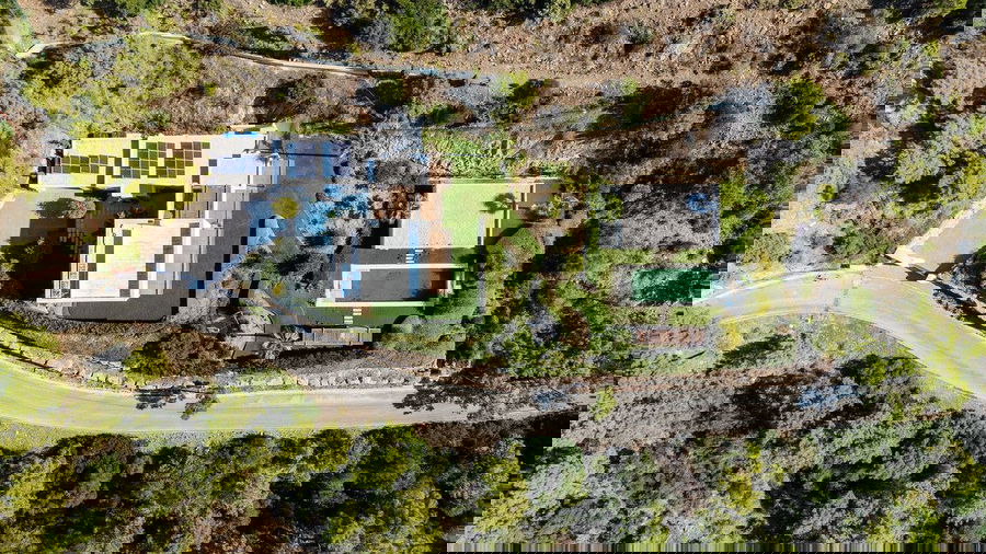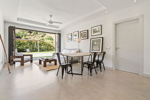 An independent guest house mirrors the same level of detail and serenity, offering two bedrooms with private bathrooms, a kitchen, and its own living area, ideal for visitors or extended family.