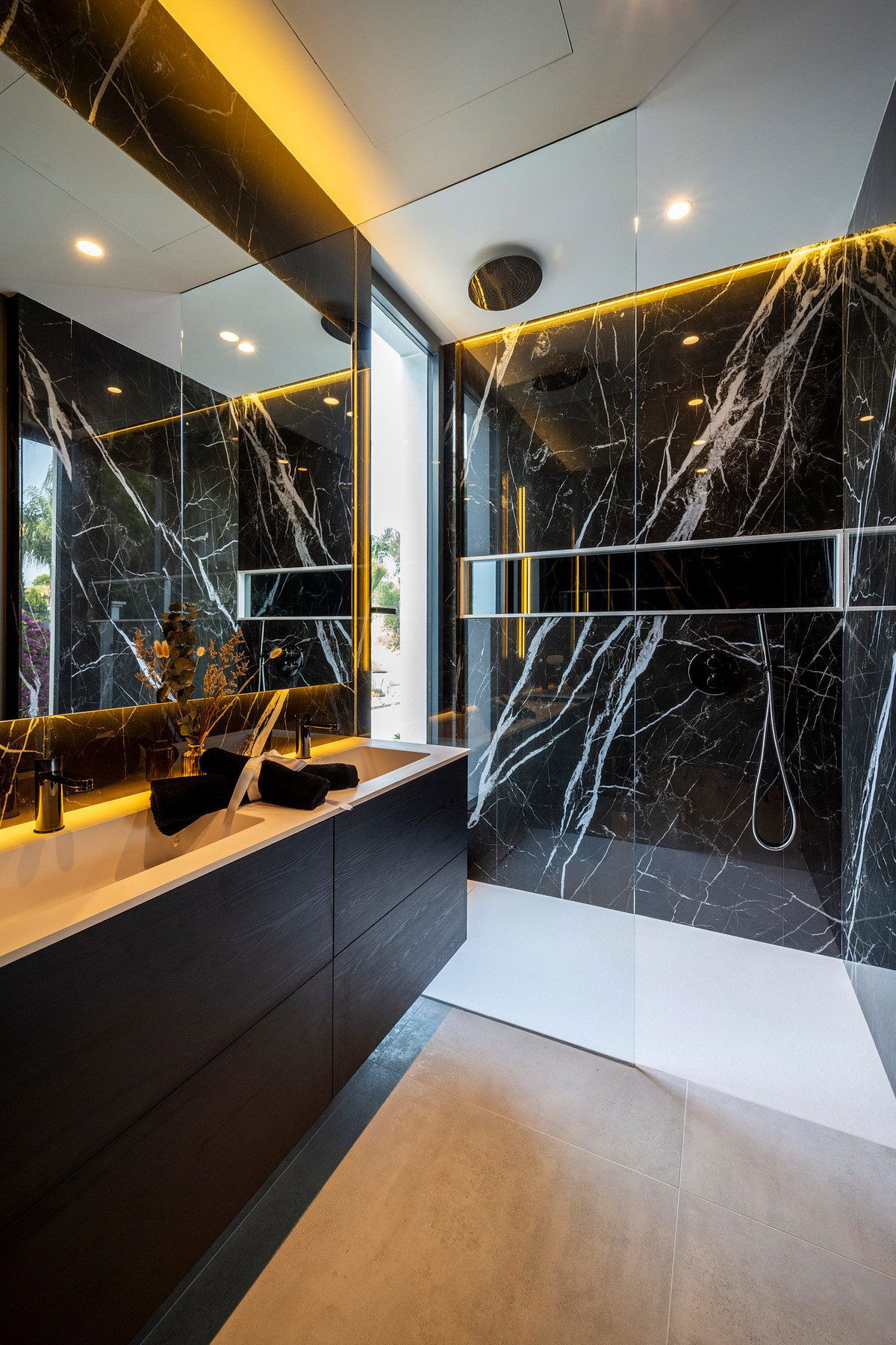 Stepping outside, you're greeted by a landscaped garden and expansive terraces ideal for relaxed lounging or hosting. The star is the infinity pool, complete with cascading water feature. Outdoors you'll also find a fully equipped al fresco kitchen to enjoy dining under the stars.