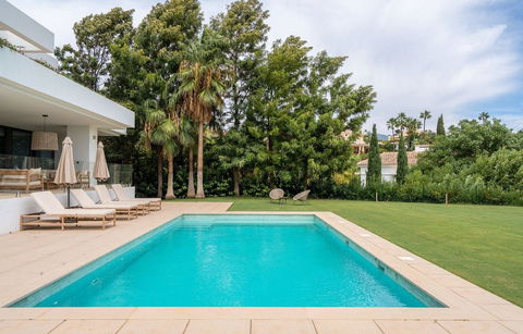This modern and elegant villa is located in the prestigious Los Flamingos area, just a short walk from the renowned Villa Padierna Hotel. Set on a 1,500 m² plot, the property features beautifully landscaped gardens and a private pool, perfect to enjoy the Mediterranean lifestyle.