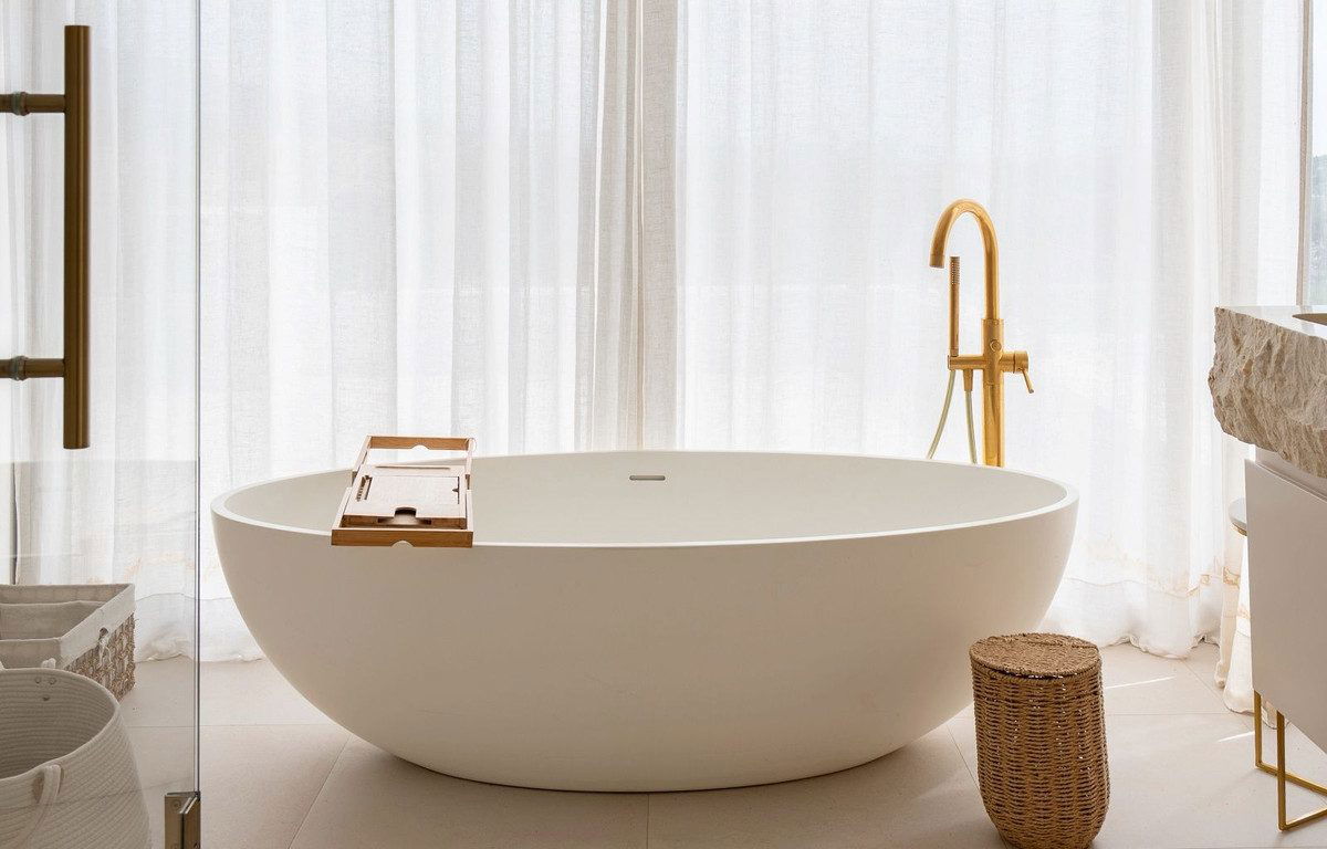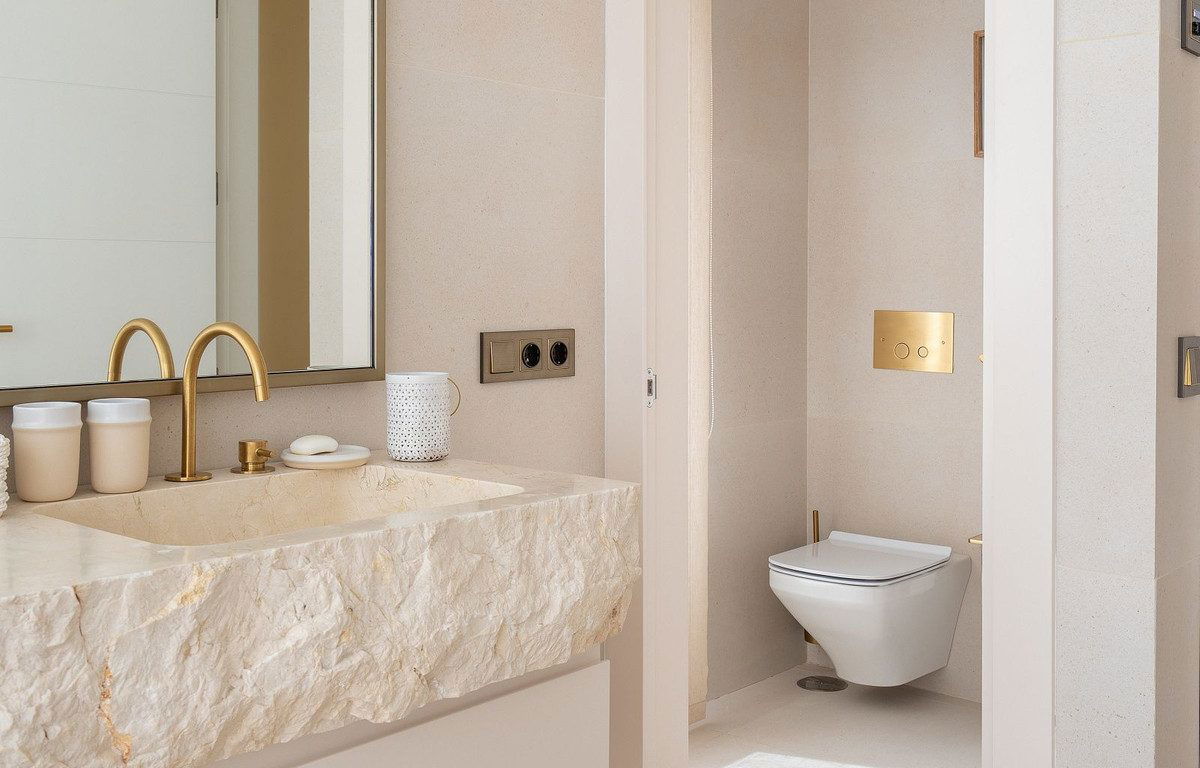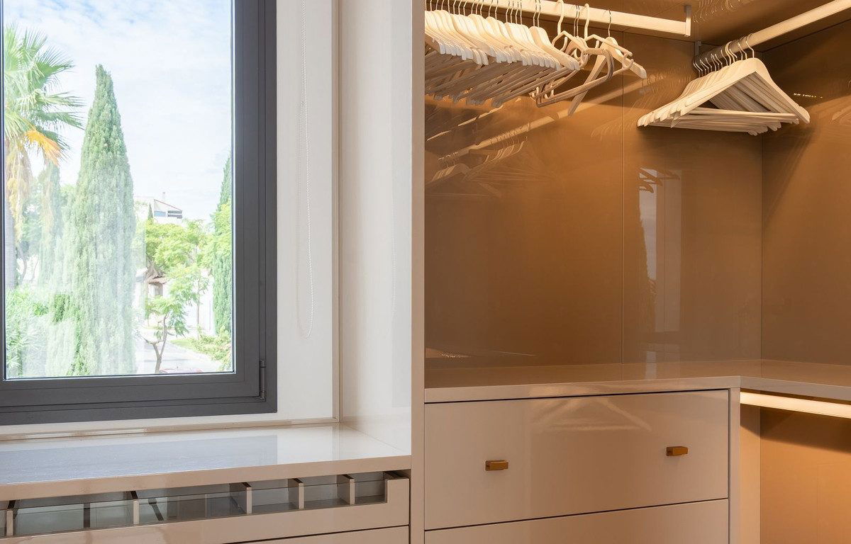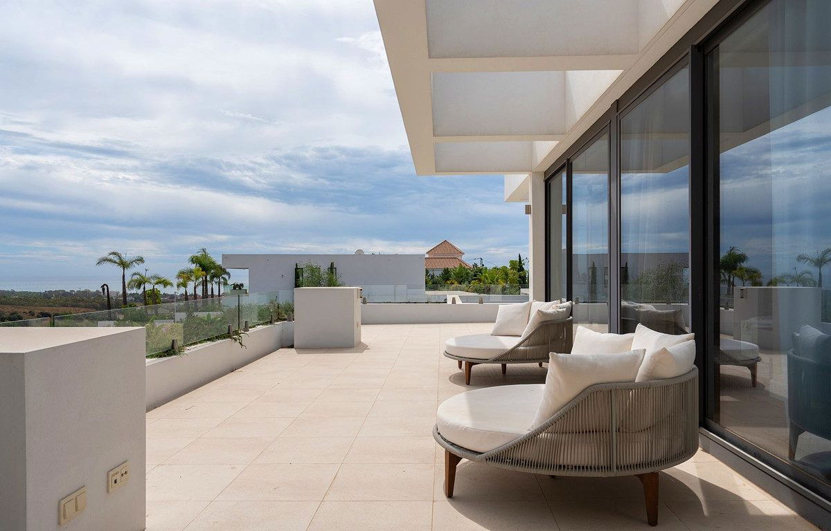 The first floor hosts two additional bedrooms, including the luxurious main suite with two walk-in wardrobes and a large bathroom featuring both a walk-in shower and a freestanding bathtub. Both bedrooms enjoy access to a private terrace with panoramic views of the sea, golf course, La Concha and the surrounding landscape.