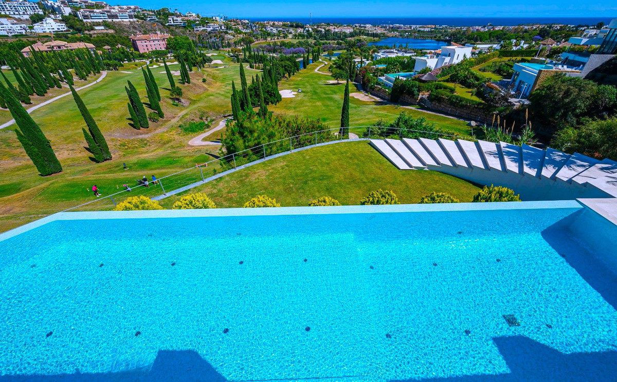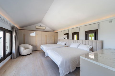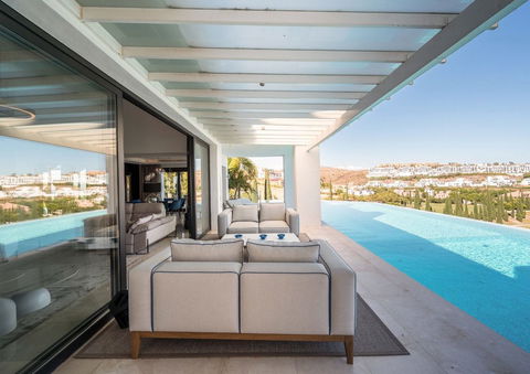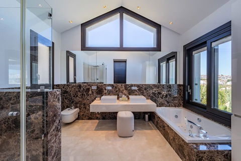 Nestled within the prestigious Los Flamingos Golf resort in Benahavis, Malaga, this luxurious villa epitomises sophistication and modern living. Boasting an expansive built area of 900m² on a generous 1,450m² plot, this property is designed to provide the utmost comfort and elegance. With six spacious bedrooms, all featuring en-suite bathrooms, it offers a perfect blend of privacy and functionality for family living or hosting guests.
