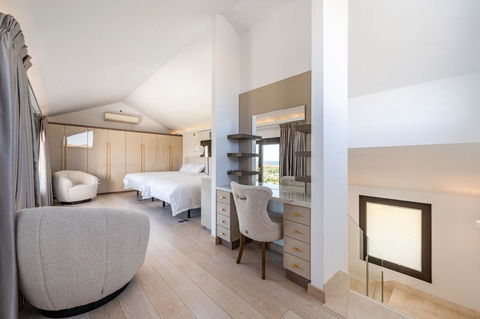 The villa's interior showcases a seamless fusion of style and practicality. The open-plan, fully fitted kitchen is complemented by a separate dining room, a utility room, and a kitchenette, catering to all culinary needs. The living spaces are adorned with high-end finishes, including porcelain floors and underfloor heating in the bathrooms, ensuring comfort and luxury. Modern technological features such as a home automation system, Dolby Stereo Surround system, and fibre optic internet enhance the property's appeal. The villa is also equipped with individual air conditioning units, double glazing, and a video entrance system, offering convenience and security.