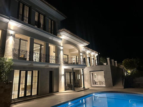 Distributed over three floors connected by an elevator, the villa offers spacious interiors bathed in natural light. The main entrance, featuring an impressive gate and ample outdoor parking, opens into a hall that reveals stunning sea views. On the main floor, there is a living room with a fireplace, a modern Italian Aster kitchen equipped with Miele appliances and a Teppanyaki station, a separate service kitchen, and an elegant dining room with a double-height ceiling, integrated wine cellar, and direct access to the terrace. This large, partially covered terrace includes lounge areas, an outdoor dining space, and a barbecue — ideal for enjoying the Mediterranean climate.