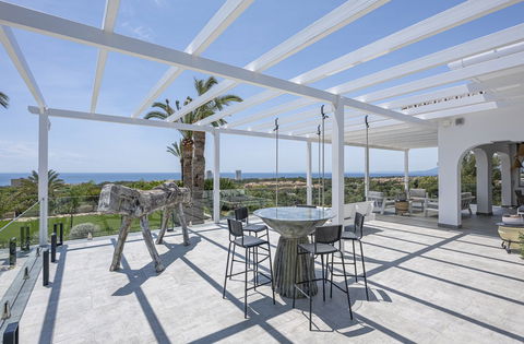 What makes this property stand out are the exceptional outdoor areas. The beautifully maintained garden surrounds the home, filled with quiet corners perfect for reading or relaxing. The terraces are extensive and varied, offering postcard-perfect views across the hills and out to the sea – the kind of views that never get old. Two stunning swimming pools enhance the appeal: one located at the main living level for easy access and another on a lower terrace, offering breathtaking views. Chill-out zones are dotted throughout the grounds, including a BBQ area, two outdoor dining spaces, a bar and both shaded and sunny spots to enjoy throughout the day.