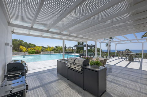 The villa's lower pool level features a self-contained apartment with private access, offering three bedrooms, 2 bathrooms, and a shower, ideal for guests, extended family, or home office. Other features include solar panels with potential for expansion, underfloor heating, three garages, and a spacious driveway for up to five cars.