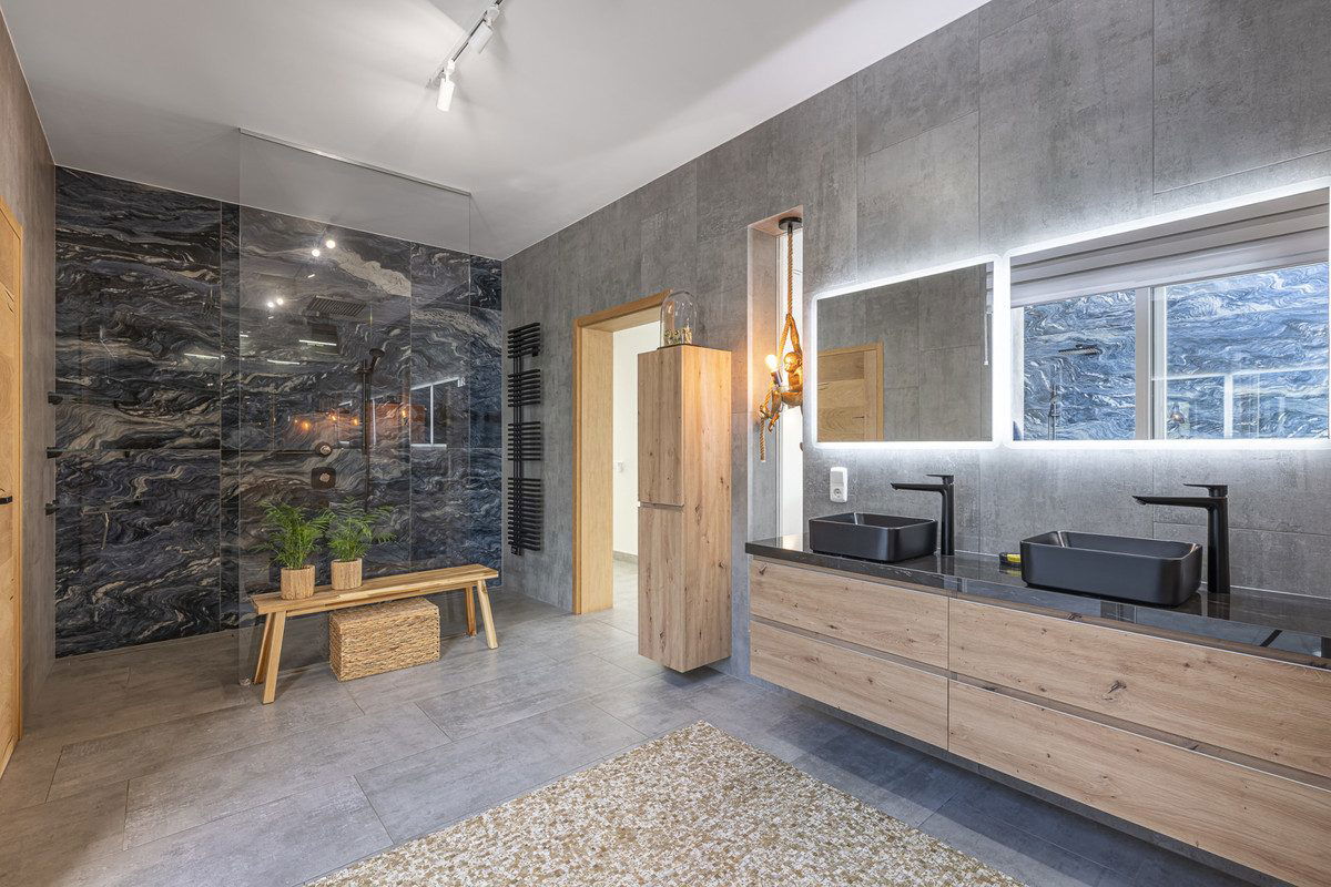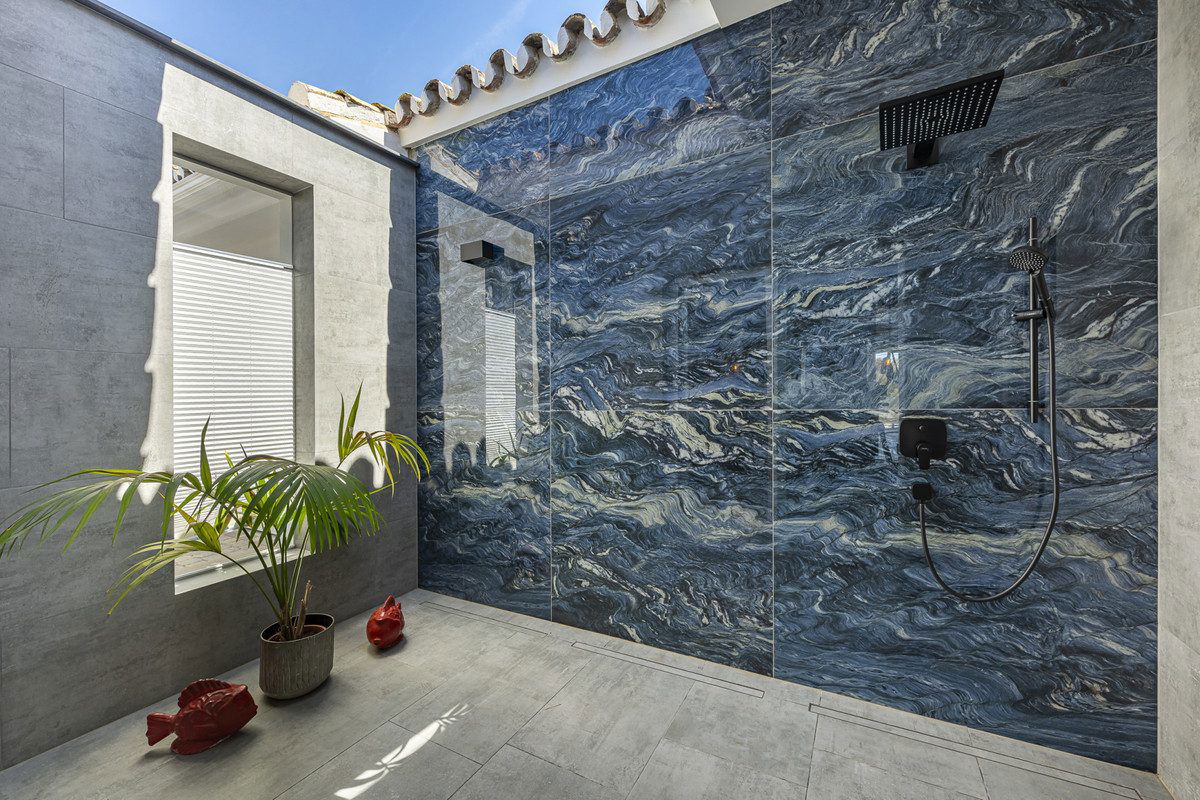 Inside, the villa feels bright, open and welcoming. The heart of the home is the spacious living room, designed with floor-to-ceiling glass doors that open directly onto the terrace, framing fantastic views of the sea and surrounding greenery. Natural light floods in from all angles, creating a warm and inviting atmosphere. The contemporary kitchen with breakfast area flows naturally into this space, making it ideal for family life and entertaining. There are four deluxe bedrooms, including a main suite with indoor and outdoor showers.
