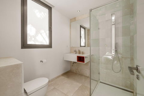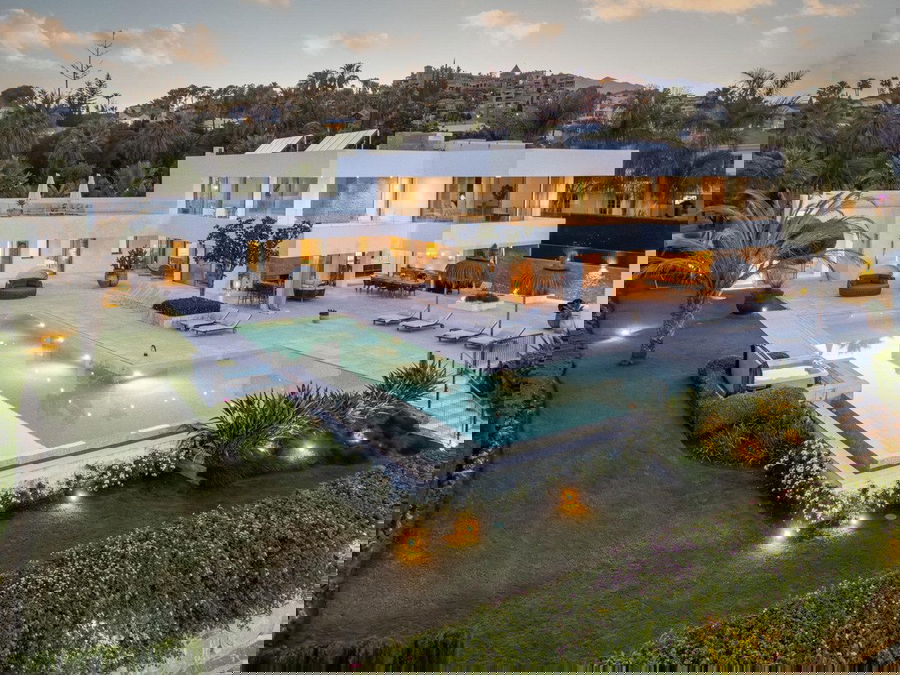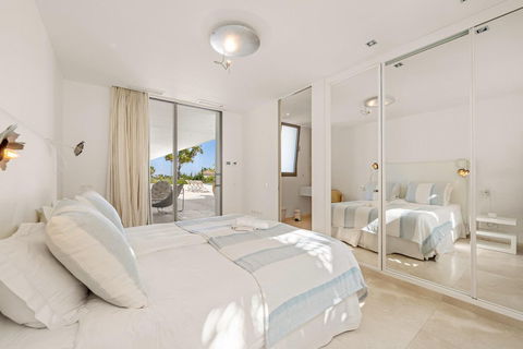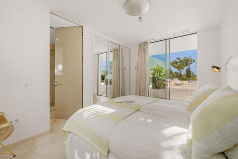 At the heart of the home is a modern kitchen outfitted with premium appliances, sleek cabinetry, and a large glass dining area framed by floor-to-ceiling windows. The seamless connection to the outdoor living spaces includes an impressive pool with a jacuzzi, Balinese- style sun loungers, and a covered dining terrace with a fireplace and barbecue setup—perfect for entertaining. What's best is the private pristine tennis court at the foot of the garden, ideal for residents to use all year round. This villa epitomises contemporary luxury in a Mediterranean setting, offering an unparalleled blend of comfort, sophistication, and location.
