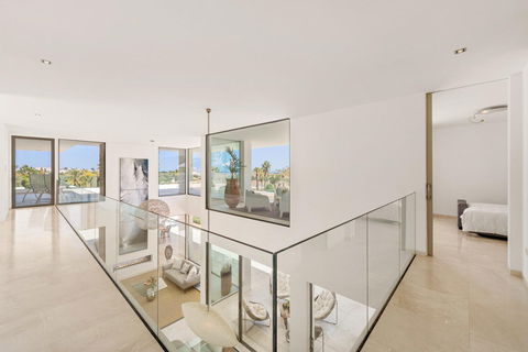 Step inside to discover expansive interiors thoughtfully designed with natural textures and rich finishes. The villa boasts soaring ceilings, elegant lighting features, and a harmonious flow between indoor and outdoor living. The main living areas are spacious and inviting, adorned with custom furnishings, organic materials, and curated decor elements such as woven wall art and hand-crafted ceramics. The upper floor showcases a tranquil gallery-style corridor overlooking the main level, with direct access to bedrooms that enjoy sweeping views and private terraces.