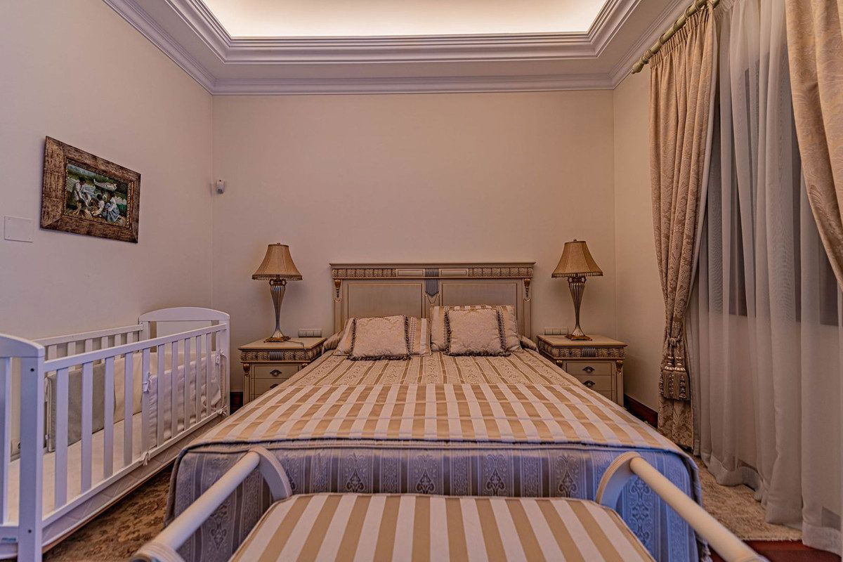 Luxury andalusian style villa that resides magnificently in one of the most prestigious and sought-after urbanizations in Marbella, Guadalmina Baja, only 100 meters from the beach and 5 minutes from Puerto Banus. The highest quality materials have been used in the design and construction of this elegant 8-bedroom home. The natural light throughout is accentuated by high ceilings and a multi-level floor plan. The villa offers a beautiful entrance hall leading to an Andalusian patio, a large fully fitted kitchen, 2 en-suite bedrooms, an elegant formal dining room and an expansive living area that leads to the covered terraces and lavish gardens. The first floor offers 3 large en-suite bedrooms and an elegant master suite with his and hers walk-in wardrobe and a private terrace with garden & partial sea views. This extraordinary property has been especially designed for a luxury lifestyle and offers a dream entertainment area that includes a pool billiard room, a fully equipped fitness suite, a Spa with sauna, jacuzzi, Turkish bath and ice fountain, a cinema room and a signature wine cellar, making this a haven of recreation. The manicured tropical gardens feature a large swimming pool, a small lake with waterfall, and a summer pergola under mature palm trees. The villa enjoys absolute privacy. Other features of this extraordinary property include: garage for 6+ cars, private lift, under-floor heating throughout, domotic system, solar panels, separate staff apartment, etc.