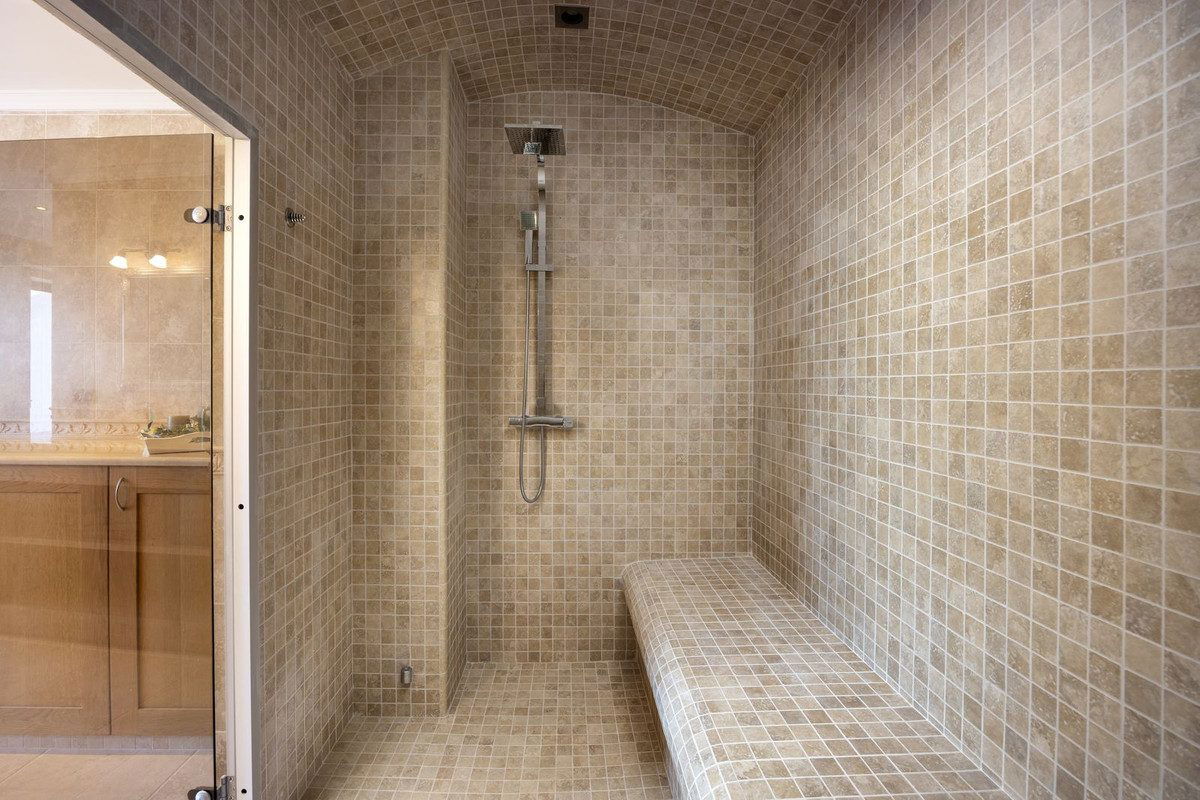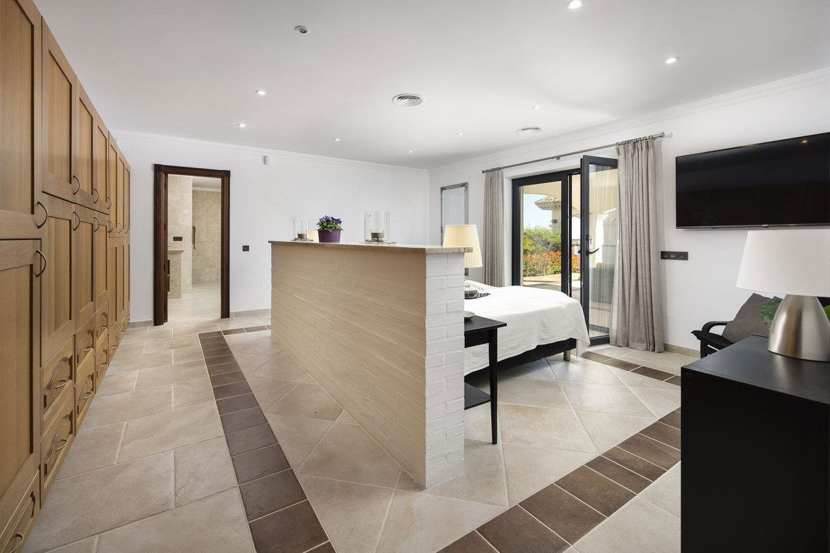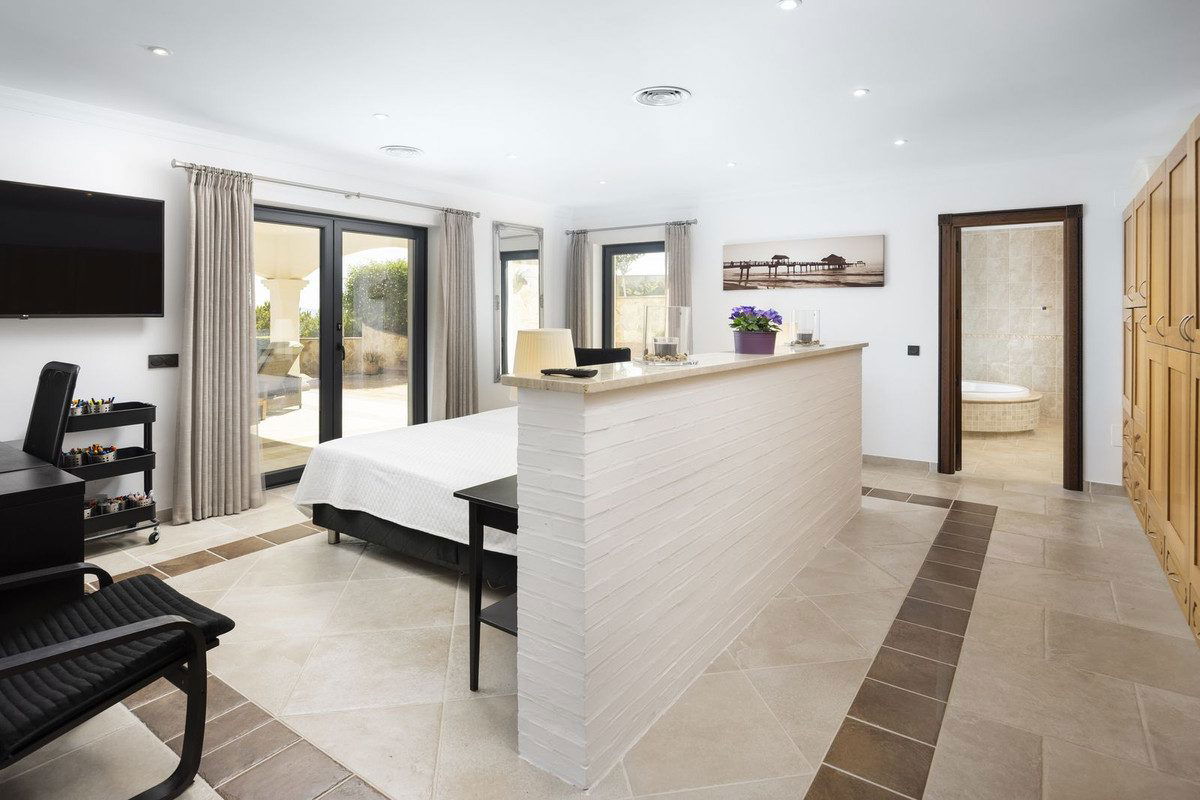 On the ground floor, a grand entrance hall with guest WC leads into a vast open-plan dining and living area. To one side is a fully fitted modern kitchen with high-end appliances including two ovens, two fridges, two freezers, induction cookers, dishwasher, microwave, and a special tap for filtered drinking water, with direct garden access. On the other side, patio doors open to a large terrace with glass curtains, perfect for enjoying sunrise and sunset year-round. The elegant living room features coloured LED ceiling lighting, direct terrace access, and a lift to the rooftop jacuzzi. The master suite on this floor boasts a wraparound terrace, a luxurious walk-in closet with central island, and an en-suite bathroom with balcony—ideal for soaking in a hot bath while watching the sun set over the Andalusian hills.
