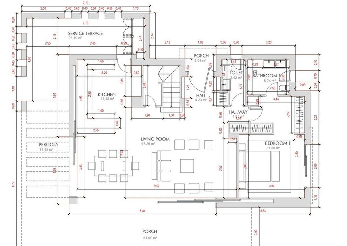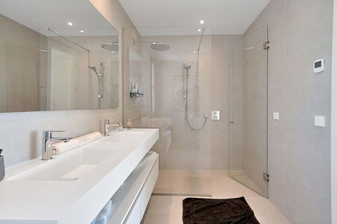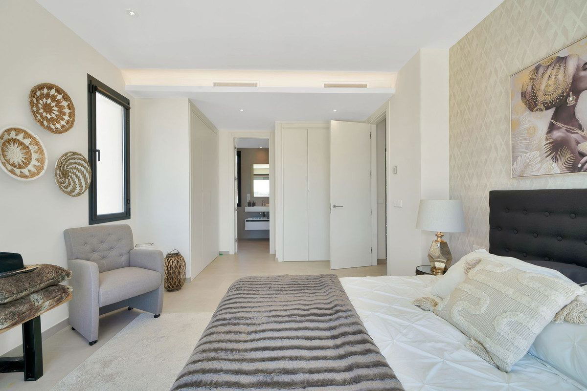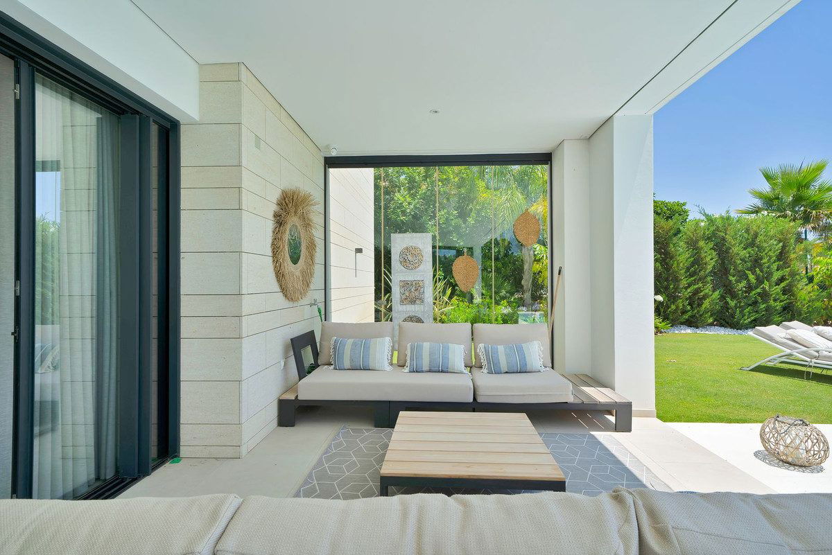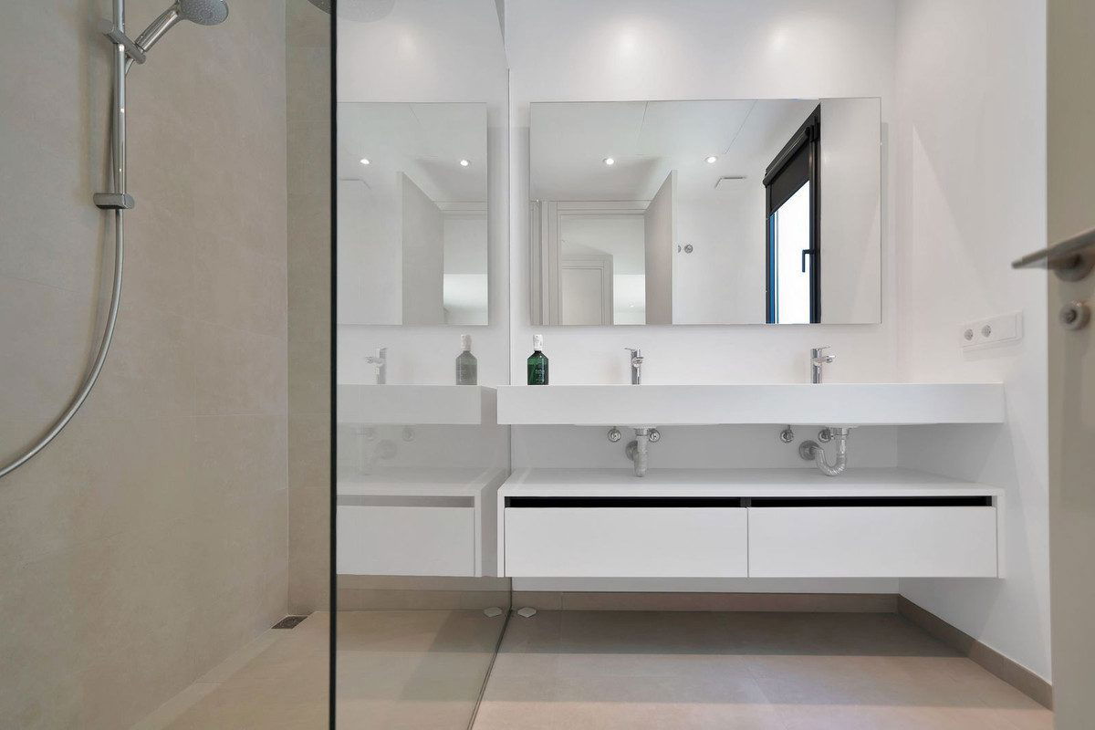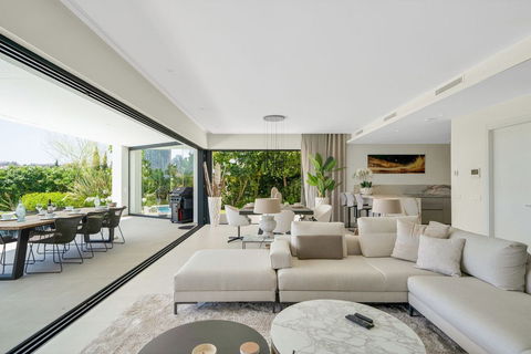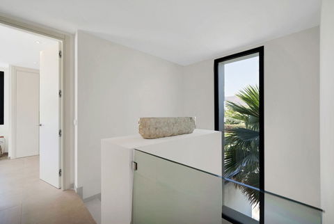 The ground floor boasts a stunning open plan living area, Through the impressive wooden front door which is both wide and tall, one enters the living room area, where the immediate impact of space and light create the feeling for this fabulous la Cala Golf villa. Floor to ceiling high quality patio doors flank all of the walls and are designed to slide delightfully into the walls, allowing that the interior open plan living space blends into the perfect alfresco experience by incorporation with the south-facing terrace. This terrace is further improved with the addition of glass curtains, meaning that come rain or shine, the outdoor space of this property is to be enjoyed, with the lovely views of the green and verdant gardens and the countryside beyond.