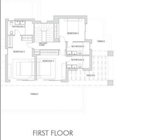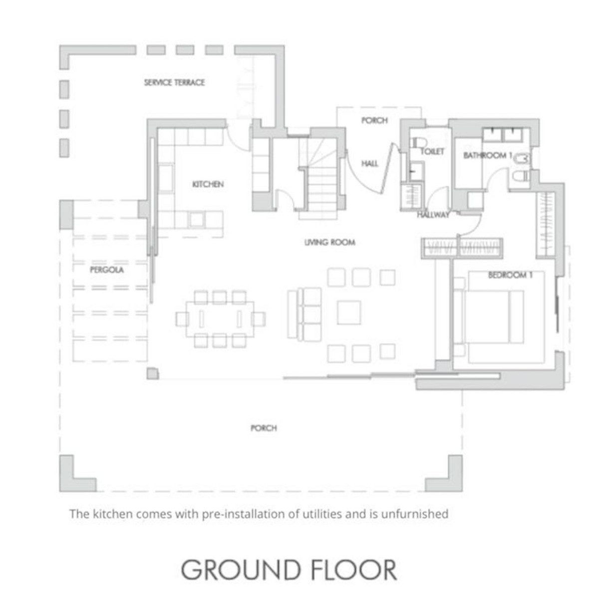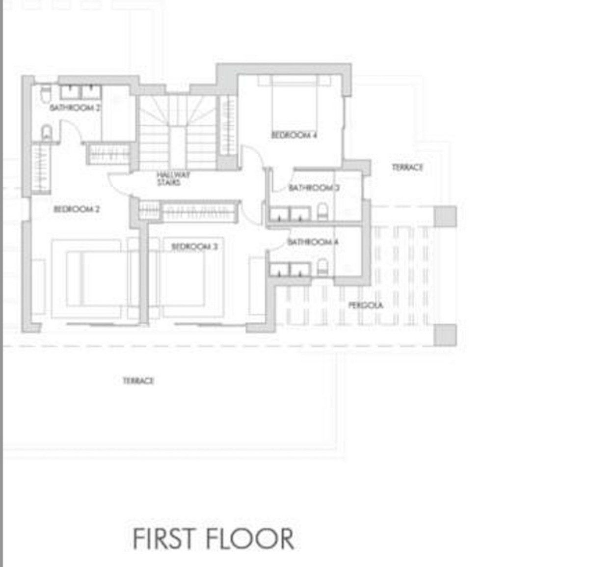 This villa is built over 314 square meters. It has the original configuration of the villas, with one bedroom and ensuite bathroom on the ground floor, and 3 bedrooms each with it's own bathroom on the first floor.