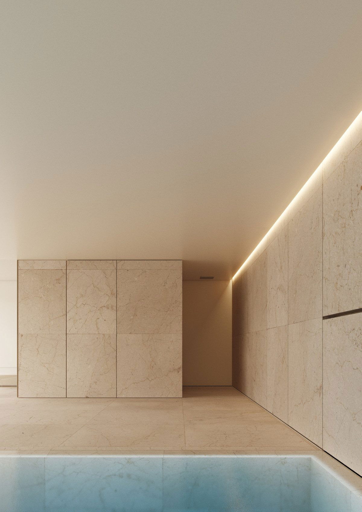 The basement of this villa features a heated indoor swimming pool, illuminated by sophisticated LED lighting, providing a warm and inviting space for relaxation, no matter the season.