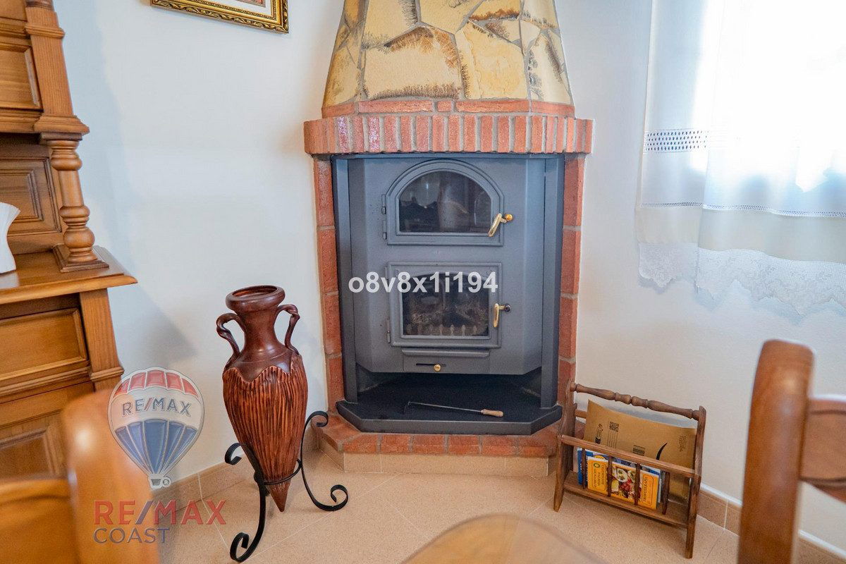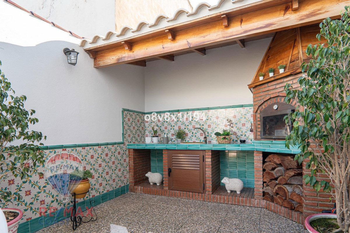 The kitchen opens onto an exquisitely decorated patio—your very own oasis—featuring a wood-fired oven, bar area, and a fountain that adds the soothing sound of water. It's ideal for outdoor dining or simply enjoying the ambiance.