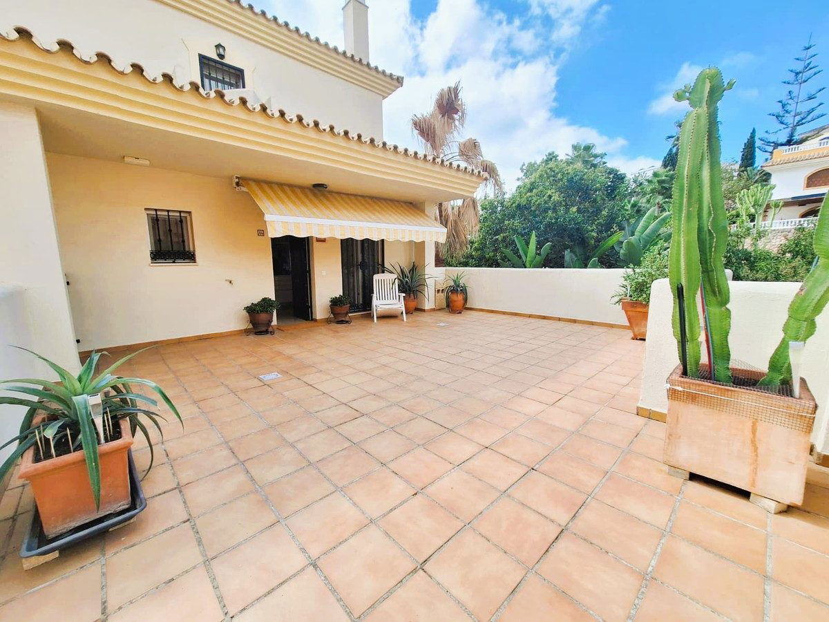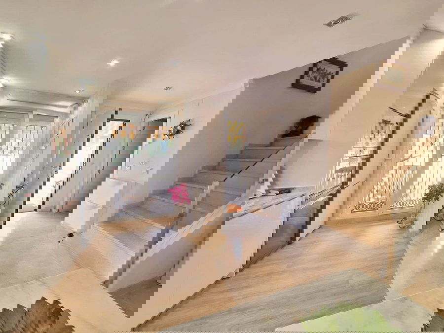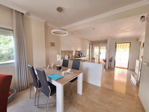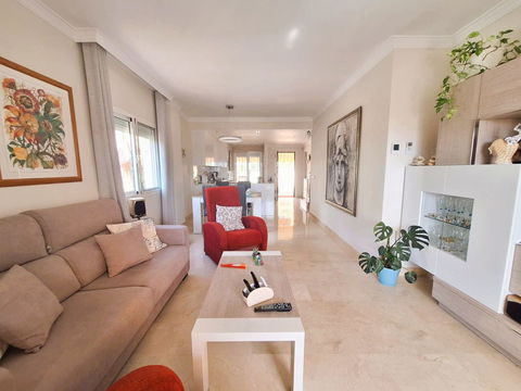 Beautiful property for sale in perfect condition in the Elviria area, close to the golf course and less than a 5-minute drive to the beach! Quiet, very residential urbanisation, ideal for permanent residence. Duplex , is on the ground level but with hight , no lift or stairs, very comfortable!!! The property is on a corner, so it is very sunny and bright and has sun all day long! Very large terrace at the entrance of the house, with awnings and afternoon sun. Upon entering, we find a spacious living room with an open, fully equipped kitchen, from the living room access to the second terrace, which faces south and offers open views of the sea, with sun all day long! There are also new awnings!