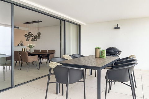 The main floor features a bright and spacious open-plan living and dining area, where large sliding doors connect seamlessly to the private terrace – the ideal spot to relax while taking in the sweeping golf views.