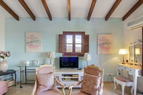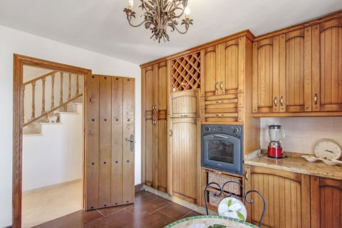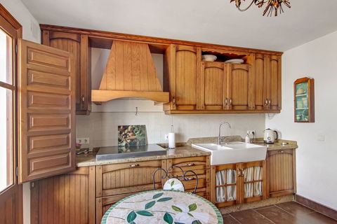 At the main entrance you will find two large bedrooms, with built-in wardrobes. There is a separate shower-room next to the bedrooms. On the way to the very spacious and open living room, you have a beautiful and rustic style independent kitchen. From the kitchen you can enter to the terrace, with amazing open views.