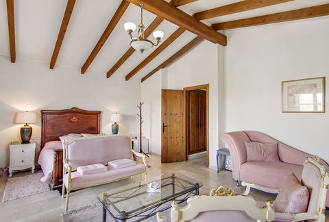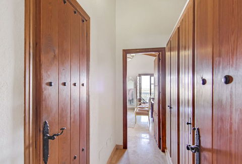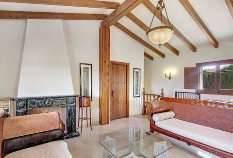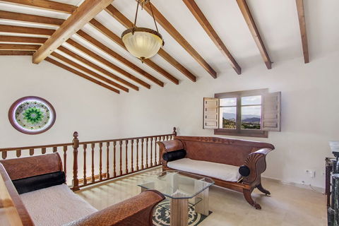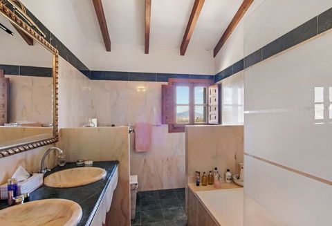 Living room is breathtaking, very spacious with high ceiling and big fireplace. Rustic style beautiful wooden framed windows, and indoor shutters, views to the countryside. There is plenty of natural light and access to the outdoor courtyard, from where you can also access the terrace. There is a potential and space to make overground pool. A lot of options for this idea.