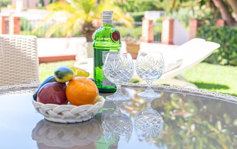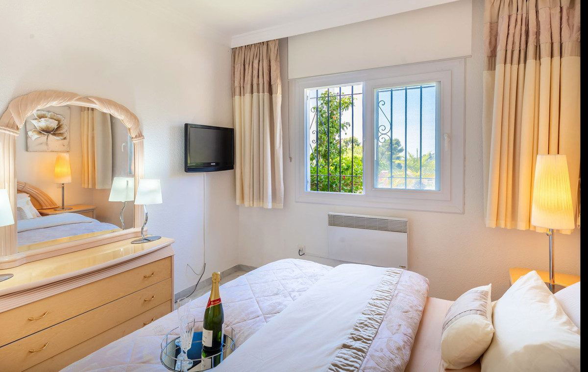 Impressive guest double bedroom with a renovated ensuite bathroom. Air-conditioning installed throughout all main rooms. The property exterior terrace is covered for protection and equipped with extendable awning over the exquisite garden area equipped with a high standard rattan dining suite and sun beds.