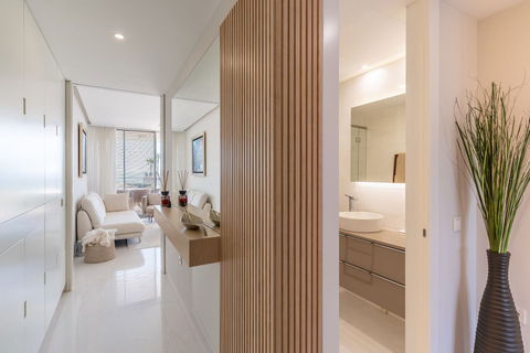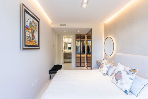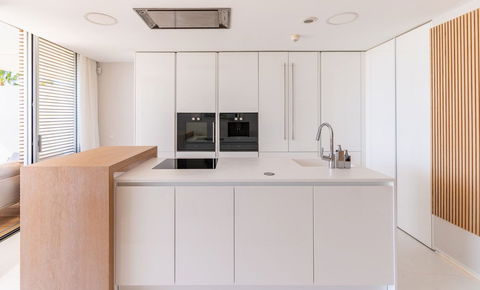 Kitchen is fully equipped with Gaggenau appliance with double fridge and freezer with ice maker, coffee maschine and warming drawer, ideal for preparing family meals in elegant space. The kitchen area is integrated with the living area. The floor-to-ceiling glass doors gives the bright and lead to the into a generous over 32 m2 terrace and private use garden. Here you can enjoy spectacular sea views. The apartment was designed with great attention to detail and the highest quality of finish, all rooms have LED lighting installed in the ceilings, in the living room there are additional LED floor strips with division into zones and dimmers in all rooms allowing to create a unique atmosphere in the evening.