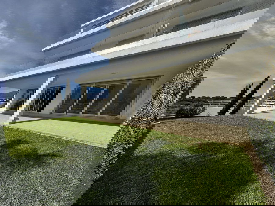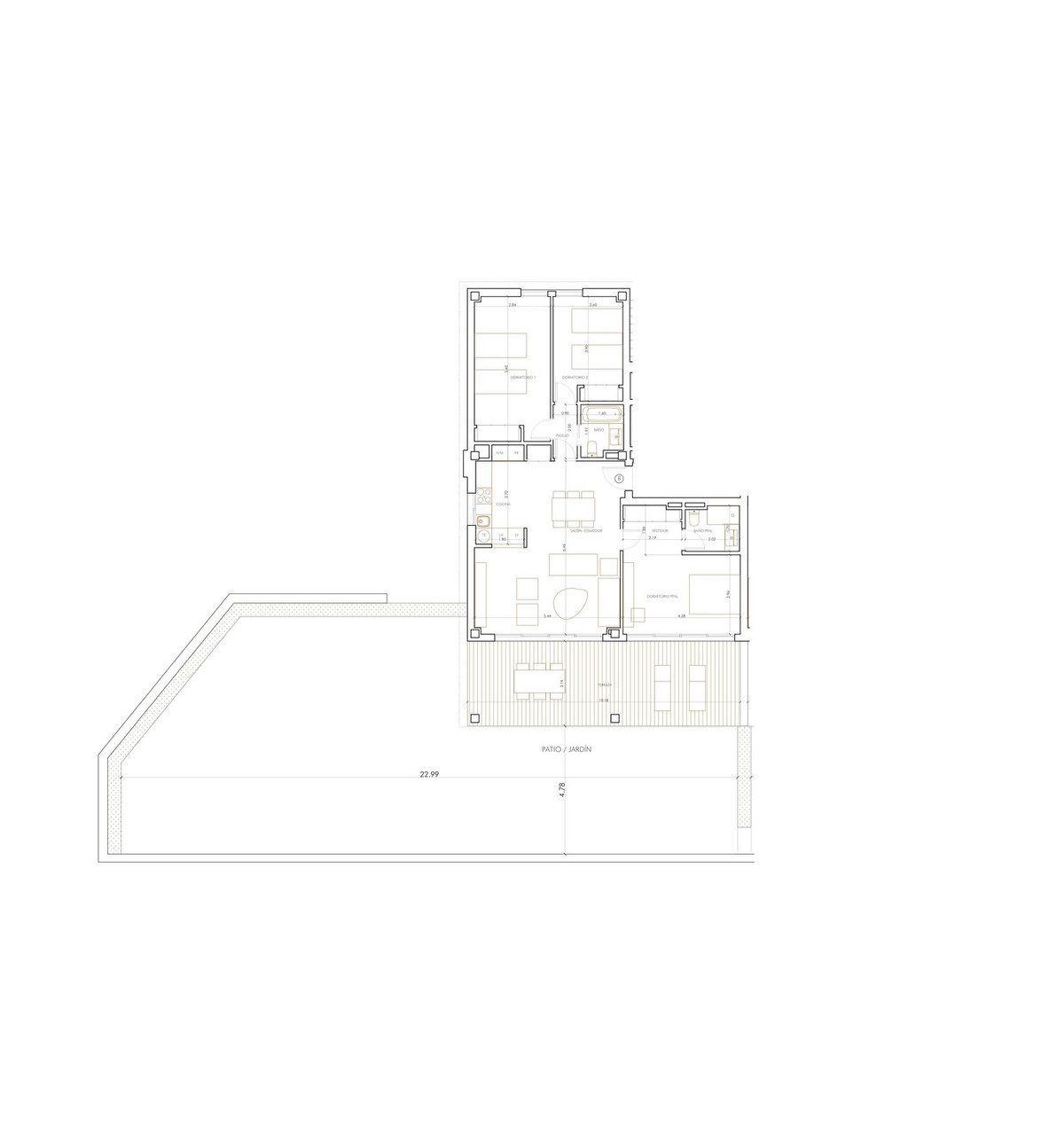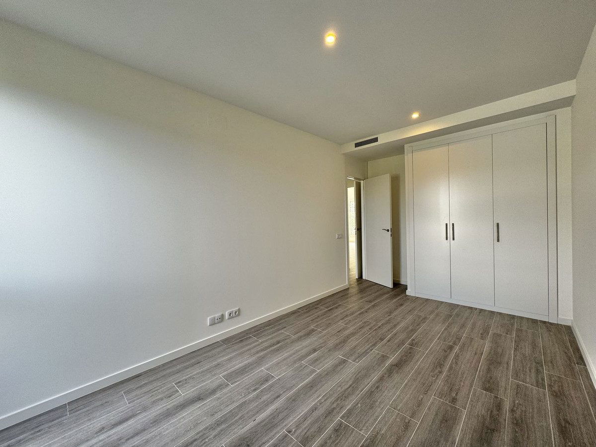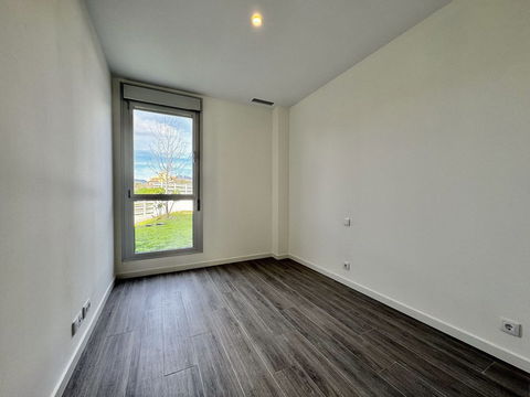 The apartment offers a spacious living-dining area with access to a covered terrace and garden, an open-plan kitchen fully equipped with Bosch appliances, three bedrooms with built-in wardrobes, and two bathrooms finished to high standards. The master bedroom also opens directly onto the garden, while the other two bedrooms enjoy views of green areas.
