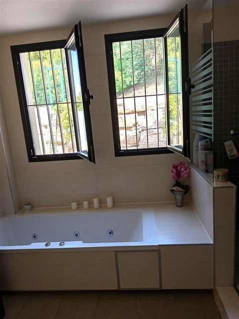 Three spacious bedrooms and two full bathrooms, one en suite with a whirlpool tub and shower. Both bathrooms have exterior windows overlooking the garden, providing natural light and ventilation.