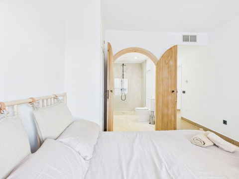 Each of the three bedrooms offers space and serenity, while the contemporary bathrooms showcase high-end fixtures and stylish stone basins. Underfloor heating throughout ensures year-round comfort.