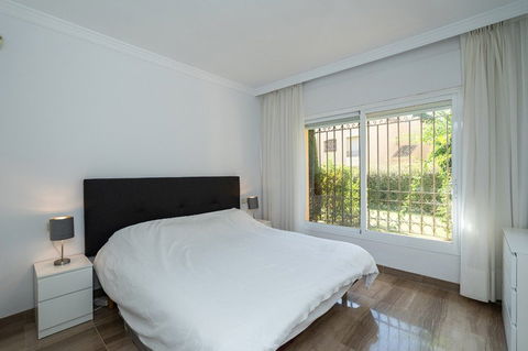 This beautifully refurbished apartment is nestled in one of Elviria's most sought-after complexes in East Marbella, offering the perfect blend of luxury and convenience. Just a short stroll from the beach and vibrant local amenities, this original two bedroom property has been converted to offer three spacious bedrooms and two modern bathrooms. The master bedroom features an elegant en-suite bathroom, while a second bathroom serves the remaining rooms. The heart of the apartment is its brand-new open-plan kitchen, seamlessly flowing into a bright living area. From here, step out onto the expansive covered terrace that leads to your own private garden – ideal for al fresco dining or relaxing in serene surroundings.