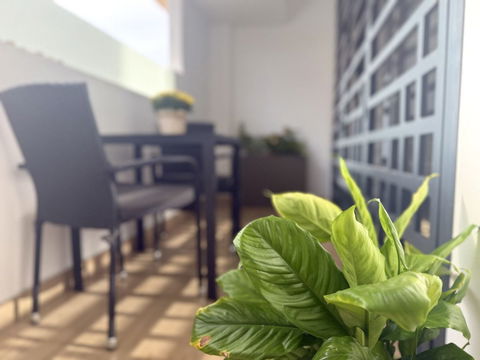 The bedroom and modern bathroom are located further inside the apartment. Large windows allow plenty of natural light into every room, and the installed air conditioning ensures a comfortable indoor environment year-round.