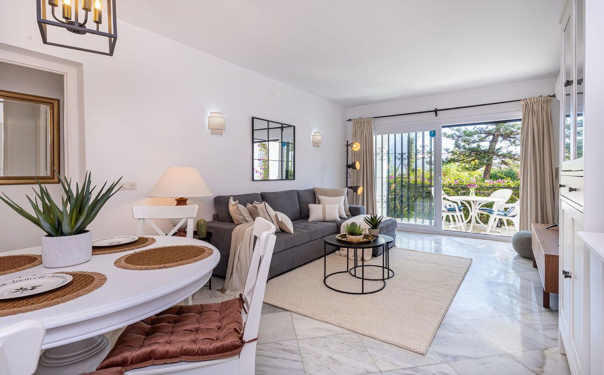 Exquisitely positioned corner status one level elevated ground floor apartment with a high interior specification fully furnished with modern furniture, offering access to a spacious immaculately maintained tropical garden situated within a prestigious community in El Paraiso Alto Benahavis, designed within tall palm residents gardens, encapsulated by the surrounding El Paraiso hills and mountains an area of outstanding natural beauty and tranquillity consistently chosen by industry professionals as a highly recommended golf, vacation and residential choice offering direct access from the exclusive community car park onto the famous El Paraiso 18 hole golf course green.