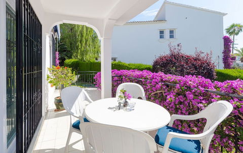 From a spacious Andalucian courtyard with ample storage closets and utilities installed, the entrance leads to a Mayfair mint wood panelled Balay appliance kitchen with opulent green marble surfaces complimented with exquisite detailed wall and floor tiling designed with a convenient open hatch wood panelled doors facing the lounge and the fuchsia bougainvillea filled exterior terrace on front of the gardens. White and light grey marble flooring throughout the living areas, elite specification double insulation thermal windows, integrated mosquito blinds, blackout blinds installed, new Dual Inverter LG Air-conditioning throughout all rooms, new lounge furniture, new beds, upgraded kitchen featuring a dishwasher. Luxuriously styled lounge and dining room offers access to an impressive double aspect dining and relaxation terrace with sun beds and a sunbathing garden area facing the tall tropical palm filled gardens and impressive garden features.