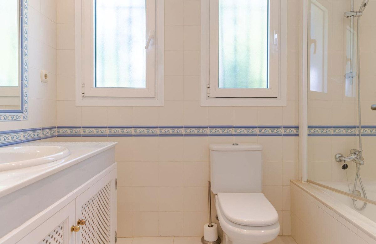 The Master bedroom with a super king bed equipped with double panelled wardrobes and offers views to the tropical gardens – Adjacent luxurious Andalucian master bathroom designed with an immaculate white marble integrated vanity unit with purpose built white carpentry, a porcelain bathtub with shower, double windows and integrated spots to the ceiling. A further guest bedroom with ensuite bathroom offers 2 beds with beautiful garden views.