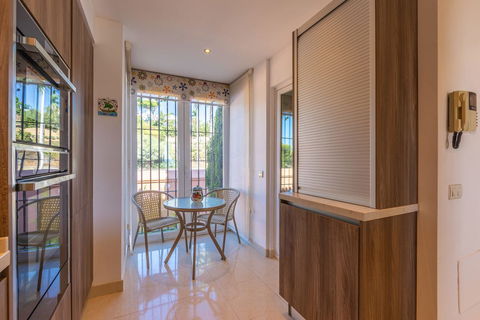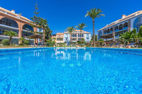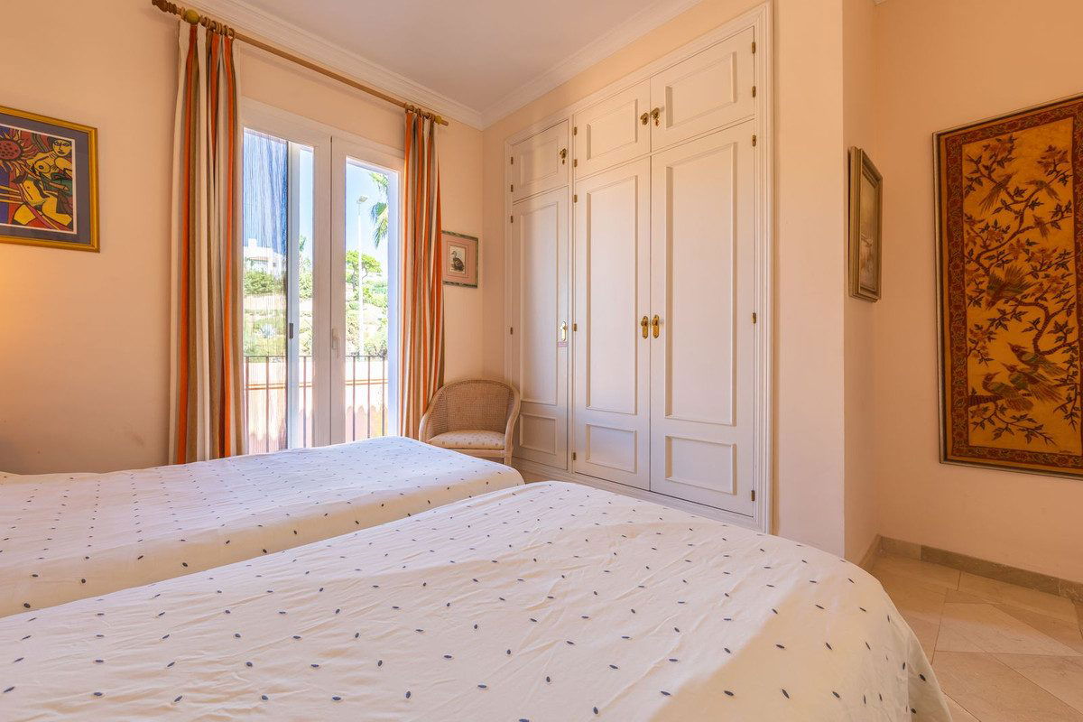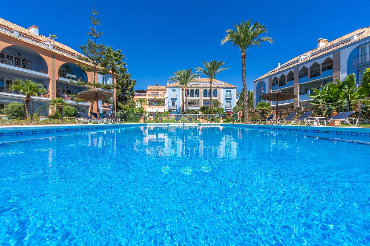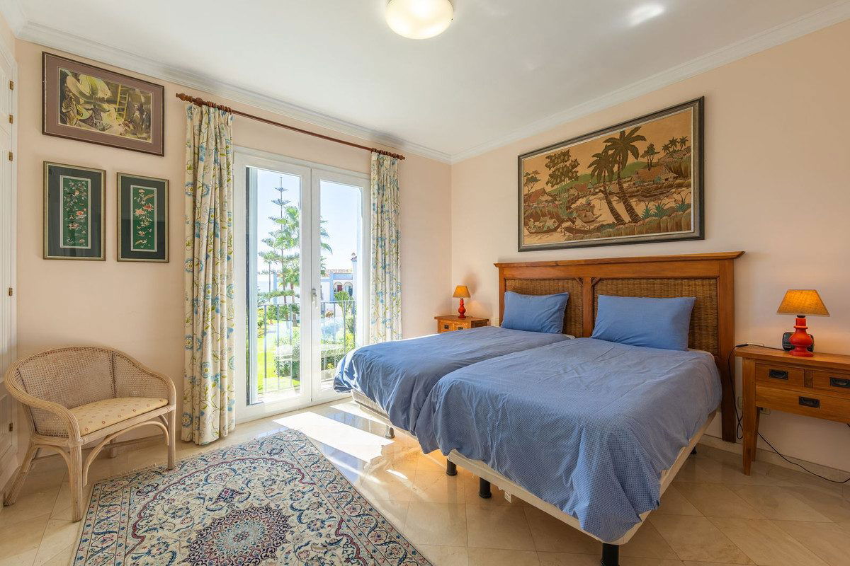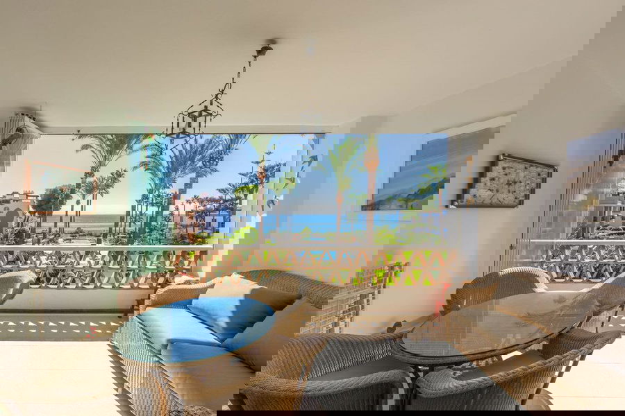 NEW ON THE MARKET: Stunning mid-floor apartment in the first line of the beach, with spectacular views of the sea, the beach, Gibraltar, and Africa, located in the exclusive Bay of Casares next to a protected historic area with an ancient Arab tower, within the prestigious La Perla de la Bahía complex featuring unique design blending Andalusian and Arab styles, surrounded by lush gardens, pools (two heated), decorative fountains, and relaxation areas; just a 2-minute walk to three beaches, two renowned restaurants, and the famous Finca Cortesín golf resort, awarded Best Golf Resort in Spain and host of the 2023 Solheim Cup; strategically located between Estepona, Puerto de la Duquesa, and Sabinillas, only 5 minutes by car, with easy access to shops, leisure, and other golf courses; gated community with 24-hour security and video surveillance; includes one garage space and a storage room; perfect both as a dream residence and an investment with high rental potential.