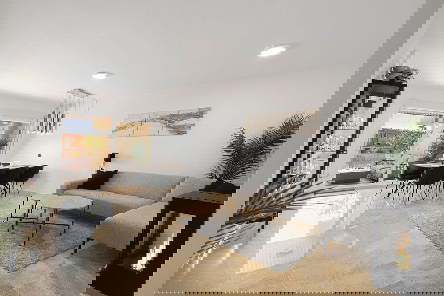 Enjoy a bright and inviting living space with elegant marble flooring, and direct access to a large covered terrace with south west orientation, offering views of the pool and partial sea views.