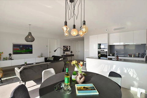 living room with comfortable seating area, dining area with 6 chairs, luxury open kitchen and sliding doors to the terrace