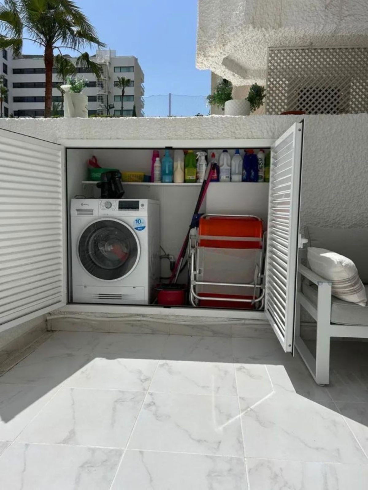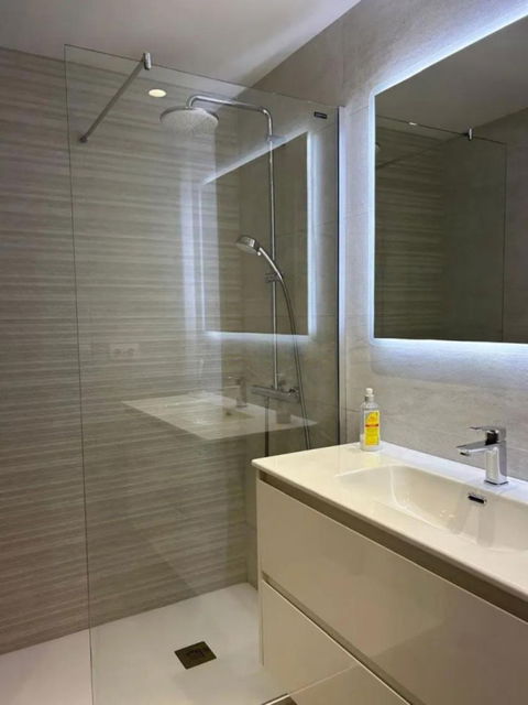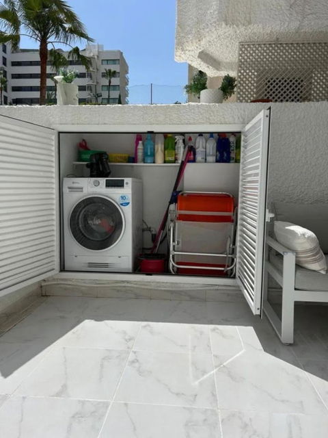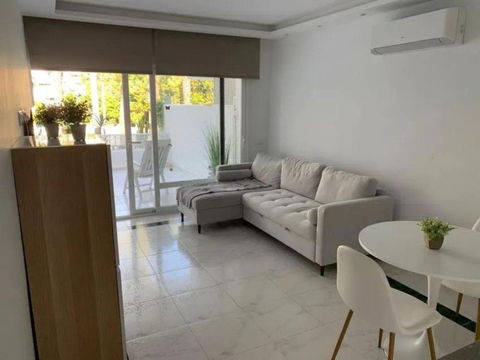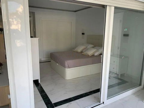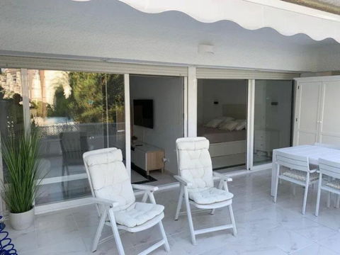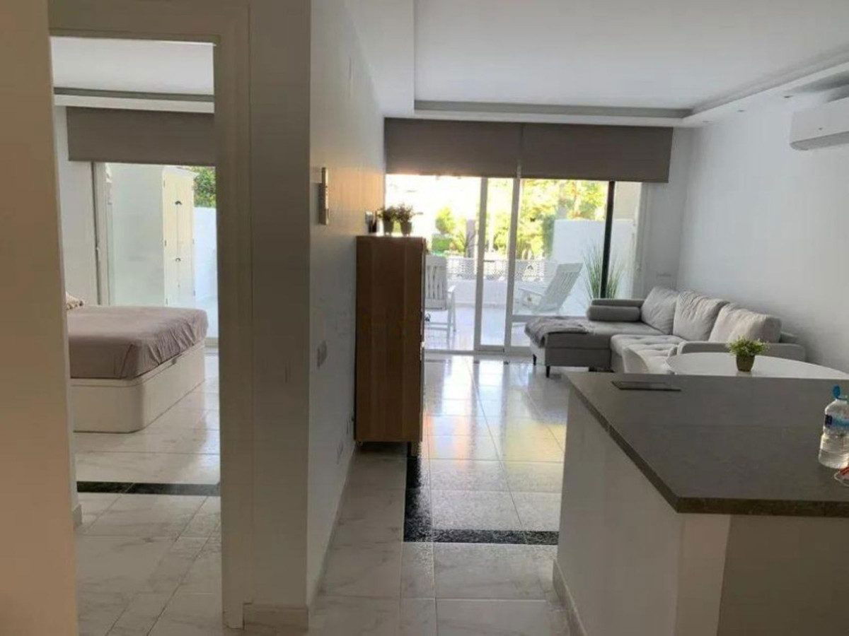 Renovated apartment for sale. One bedroom, brand new bathroom, American kitchen with plenty of storage space, two built-in wardrobes, hot/cold air conditioning and electronic radiators. Smooth paint. Indirect lights adjustable in intensity and perimeter recess to create atmospheres. Very bright. Camouflaged designer sockets. On the terrace, a room for a washing machine and storage has been built. It has a washer-dryer. Electric awning. The apartment has 58 useful square meters and the terrace 30 useful square meters. Brand new hot water heater. Water is not paid for, it is included in the community fee. Possibility of making a second bedroom since the square footage of the house is large. Quiet urbanization designed by the architect Fernando Higueras, with a tropical garden, with two swimming pools, fountains, an artificial river with fish, frogs, ducks.. . IT HAS DIRECT PEDESTRIAN ACCESS TO THE BEACH, without having to cross the road, two showers for when you return from the beach to remove the sand, with direct access to the pool from the beach.