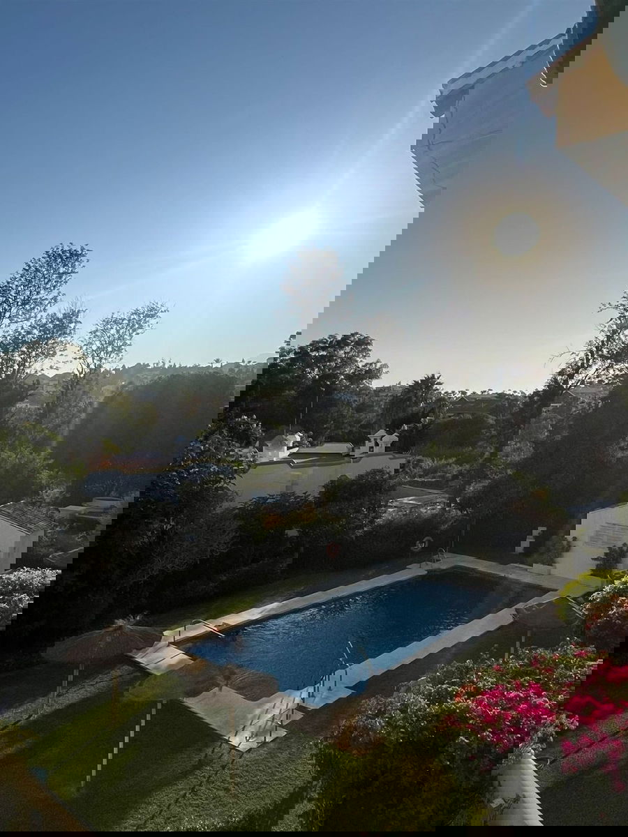 L- shaped terrace with glass enclosure between new tiled terrace and to te open space of the terrace. The L-shaped terrace has two functions. One part of the terrace is a winter but it is beeing used as a play room for the owners childreen today. You can use it as a dining room to enjoy the beautiful sunset and views of the gardens in front.