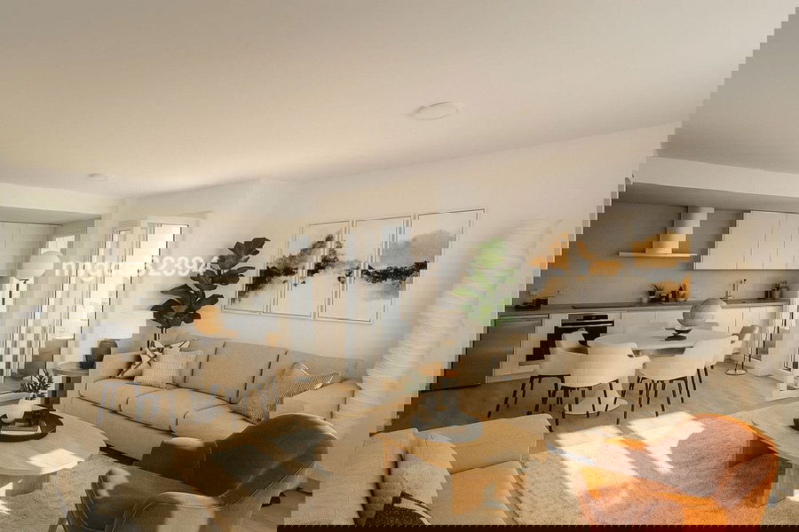 The apartment features open-plan interiors with floor-to-ceiling glazing, a sleek integrated kitchen, and direct access to two generous terraces capturing soft sunlight and partial views of the golf course and surrounding mountains. The layout provides three spacious bedrooms and modern bathrooms, designed to offer both privacy and comfort. A curated furniture package, mirroring the current presentation, is available for those seeking a ready-to-enjoy home or an effortless rental investment.