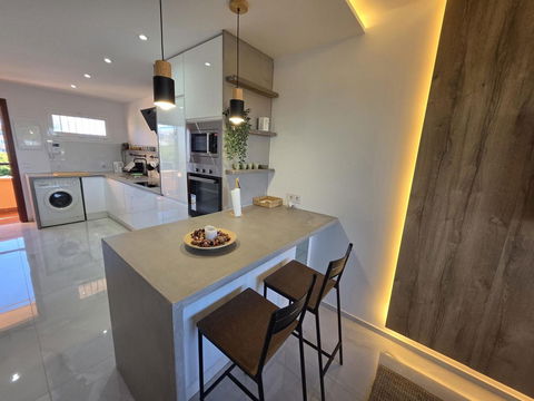 Inside, everything feels bright, open, and brand new. The spacious bedroom is a great place to relax, and the beautifully updated bathroom includes underfloor heating for an extra touch of comfort. The sleek open-plan kitchen features a contemporary breakfast bar, high-quality cabinetry, and brand-new integrated appliances, seamlessly connecting to the airy living space. You'll also enjoy centralized air conditioning and heating, double-glazed aluminum windows, and electric blinds for year-round comfort. The smart-home system lets you control lighting, blinds, and temperature directly from your phone or via voice command. Fully furnished with premium finishes, it's truly move-in ready.The communal pool and gardens are immaculately kept and the apartment comes with its own private parking space.