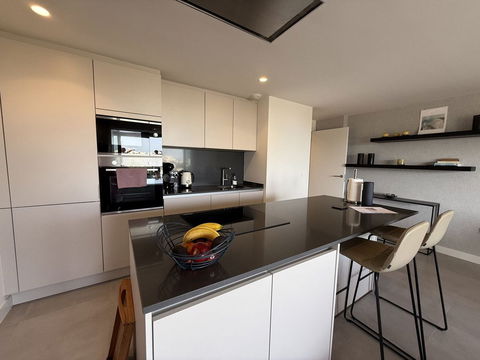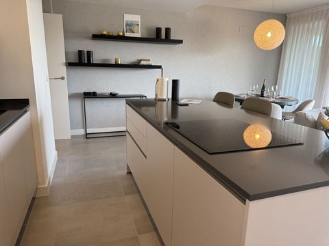 The interior living space of 102 m² flows naturally into a spacious 28 m² terrace that faces southwest, ensuring sun from late morning until sunset. The layout includes an open-plan living and dining area with large sliding doors that open directly onto the terrace. The fully equipped kitchen is centered around a sleek island with integrated induction hob, combining elegance and functionality in a space designed for both cooking and socialising.