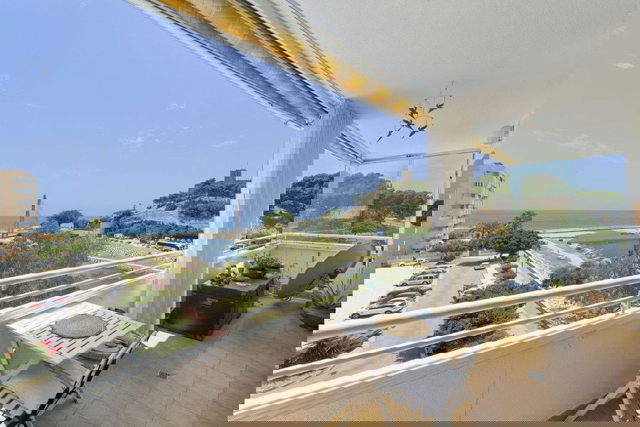 The building boasts shared amenities such as green areas, a community pool, and a designated room for storing bicycles and beach chairs. The orientation of the terrace and the building's position allow for uninterrupted views along the coast and towards the castle. The property's proximity to the river ensures that there are no immediate buildings obstructing the view.