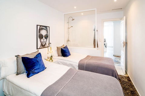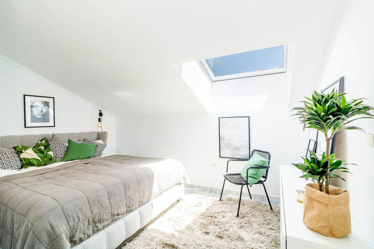 On the top floor you find the en-suite master bedroom, with its own terrace and skylight as well as an en-suite guest bedroom. Both the bathrooms have skylights.