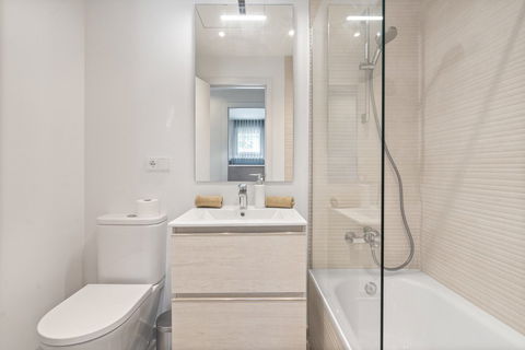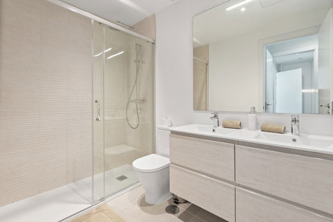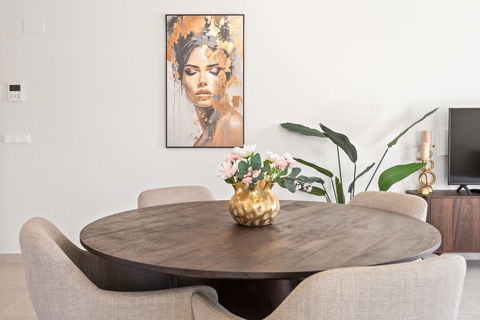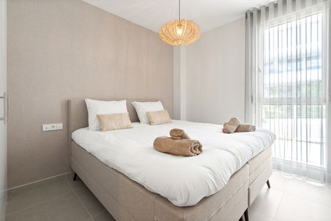 The interior is spacious and light-filled, with a modern open-plan living and dining area that connects effortlessly with the outdoor space. The fully furnished property is delivered turnkey, ready to move in and enjoy immediately. The kitchen is fully equipped with high-end appliances, and both bedrooms feature built-in wardrobes and elegant bathrooms.
