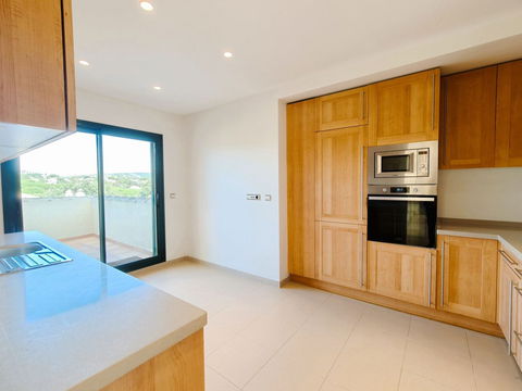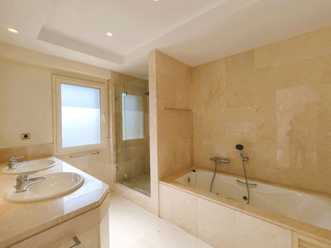 The fully equipped kitchen includes a private breakfast terrace, while modern comforts such as air conditioning (hot/cold), underfloor heating in the bathrooms, and a guest toilet ensure year-round luxury. Direct lift access leads to the garage and storeroom, with three private parking spaces for ultimate convenience.