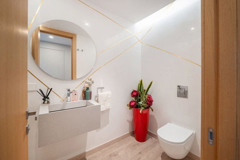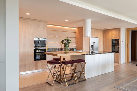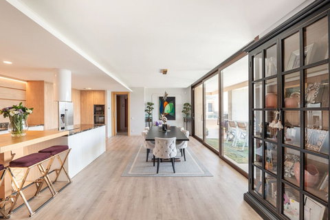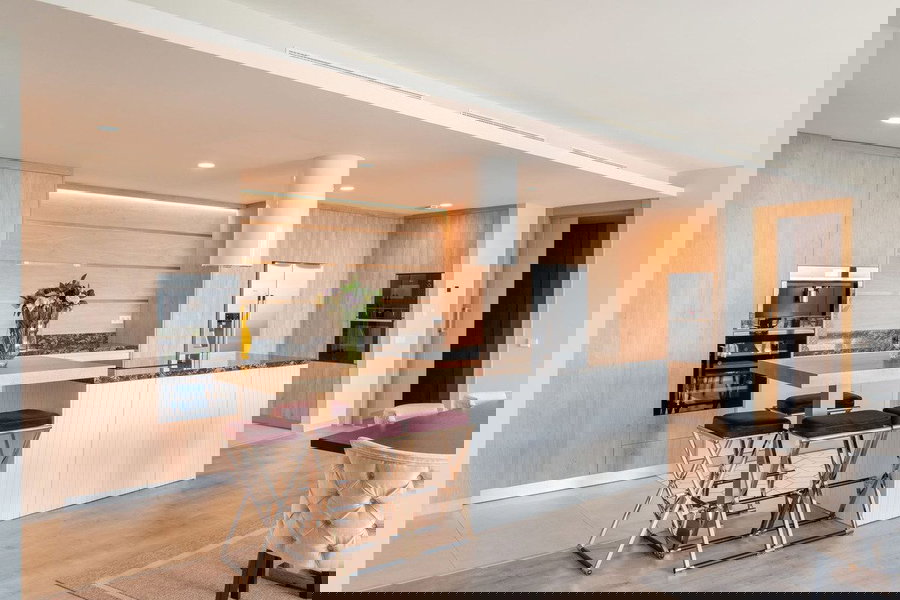The apartment includes bespoke interior and exterior finishes, an innovative use of space with seamless indoor-outdoor integration, and an abundance of natural light. The large open-plan kitchen comes with a cooking island, breakfast bar, and a dedicated dining area, complemented by an integrated living room. It is equipped with modern amenities such as air conditioning for cooling and heating, fitted wardrobes, and a fully fitted kitchen with all appliances. The apartment also includes 3 underground parking spaces and 2 storage rooms, and features high-quality materials like ceramic, wood, and marble floors.