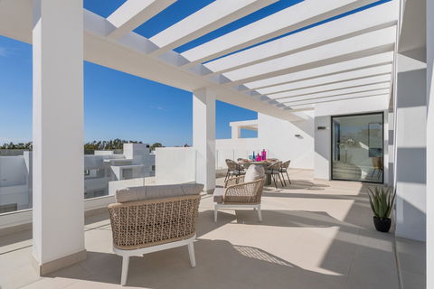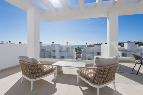 The penthouses at this resort in Estepona offer a true taste of Mediterranean luxury. Enjoy stunning sea views from your spacious terraces, complete with an exclusive jacuzzi on the rooftop. These bright, three-bedroom homes create a peaceful, upscale environment. You'll have access to top-notch amenities designed for your comfort, including an infinity pool, a fully equipped gym, a gourmet lounge, and dedicated yoga spaces. Located near beautiful beaches and world-class golf courses, the resort is also just a short walk from Estepona's charming old town, where you'll always find something new to explore. Plus, you're perfectly connected to Marbella, Sotogrande, and Malaga. These penthouses come with high-end finishes, such as motorized blinds opening onto the terrace, underfloor heating in the master bathroom, and a state-of-the-art kitchen, ensuring comfort and exclusivity throughout your home.