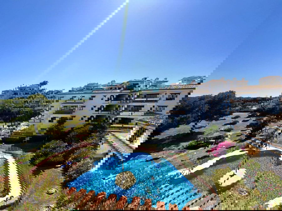 Step out onto the balcony and enjoy lovely views over the impeccably maintained gardens and pools, with partial sea views adding to the charm.