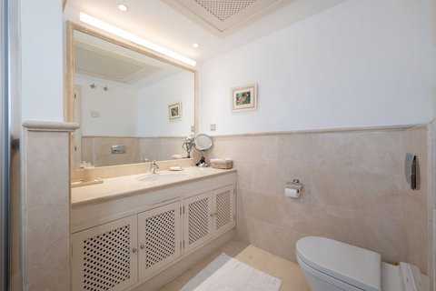 The townhouse includes a total of four bedrooms. Two bedrooms are located on the first floor, and two are in the basement. The master bedroom on the first floor boasts its own walk-in closet and en-suite bathroom. The adjacent bedroom also has its own bathroom. Both bedrooms offer stunning views of the sea and mountains.
