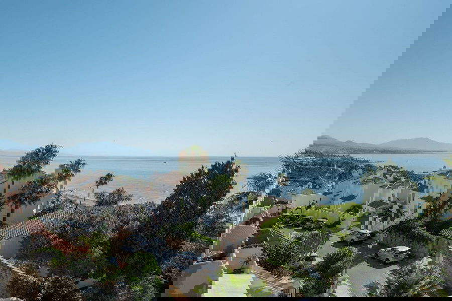 The house comprises three spacious bedrooms and three bathrooms, with an open-plan layout that allows for flexible use of space. Panoramic views of the Mediterranean Sea can be enjoyed from the terraces and balconies.